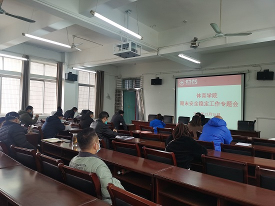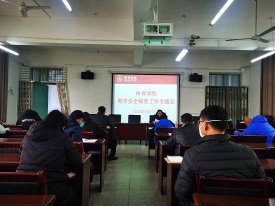会上,付和忠传达了学校相关会议精神,对期末学院安全稳定工作,提出明确要求:一要提高站位,强化责任,增强对安全稳定工作极端重要性的认识;二是班主任要掌握学生去向,确保所有学生安全到家,密切关注学生的思想动态,做好特殊群体学生工作;三是加强师生假期安全教育,增强安全防范意识,各科室、实验室、场馆、宿舍、教室要做到关门关水关电,防火防盗防事故;四是做好疫情防控工作,加强健康监测,增强防护意识,做好个人防护措施;五是加强意识形态工作,抓好网络安全管理,确保网络安全 。