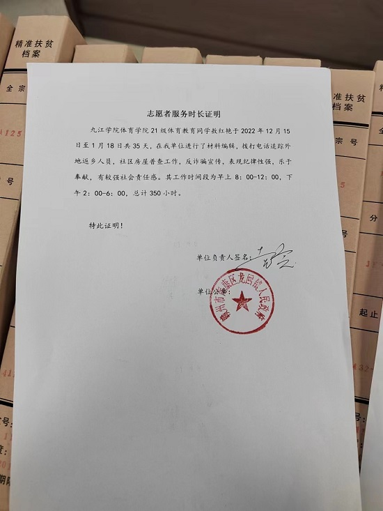 A2112班敖红艳回到家乡后积极参加志愿活动,为期35天。在社区整理扶贫资料,进行材料编辑,拨打电话追踪外地返乡人员,社区房屋普查工作,反诈骗宣传等。表现纪律性强,乐于奉献,有较强社会责任感。她表示:我很荣幸能成为传递爱心、志愿服务、乐于奉献、不求回报为宗旨的一名志愿者。作为新时代的青年,我们不能养尊处优,而应该履行义务,肩负起时代赋予的责任。