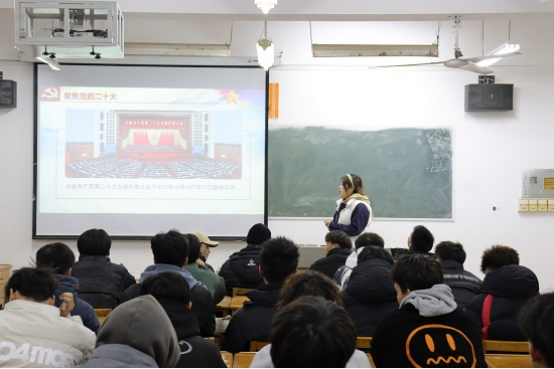 12月6日晚上,万象城allwincity官网在团支部中开展“永远跟党走,奋进新征程”为主题的党的二十大精神宣讲活动,学院学生会学习部部长兰家慧在竞知楼1001教室为A2211班团支部进行宣讲。