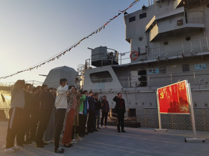 在石钟山脚下的九江舰爱国主义教育基地,在讲解员的引导下,我们登上了威武的九江舰参观。在舰上参观了前主炮监控室、驾驶舱、会议室、主机超控室等,近距离感受当年九江舰官兵战士执行任务的环境和人民海军的光荣历史,学习人民海军光荣传统和优良作风,以及维护国家海权的意志品质,感受我国海军的改革发展历程和实力的快速增强。