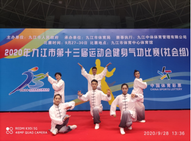 2020年九江市第十三届运动会健身气功比赛(社会组)于9月27日在九江市体育中心体育馆开赛。本次比赛有来此全市14个县、区代表队近100名运动员参加,比赛共设五禽戏、八段锦、易筋经、气舞四个集体项目。万象城allwincity官网教师代表濂溪区参加了所有四个项目的比赛。