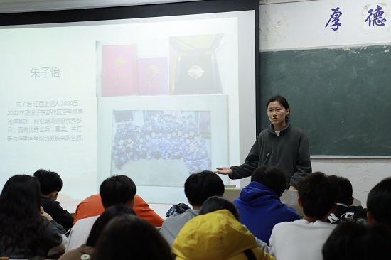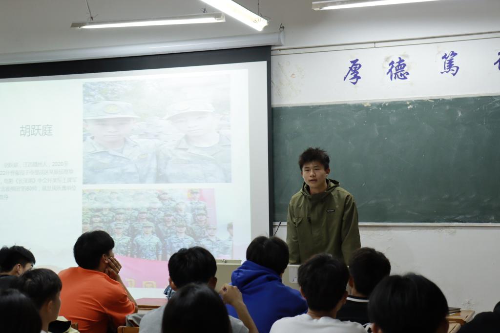 本次宣讲会特邀请卢敏康、刘纪昕、李嘉欣、胡跃庭、朱子怡五名退伍同学进行宣讲。宣讲中,他们结合自身的部队生活,向同学们分享了他们的军旅故事,畅谈爱国情怀,鼓励大家投身祖国强军伟业和民族复兴伟大征程,让同学们深深感受到了退伍军人身上的责任和担当以及对祖国的忠诚和热爱。