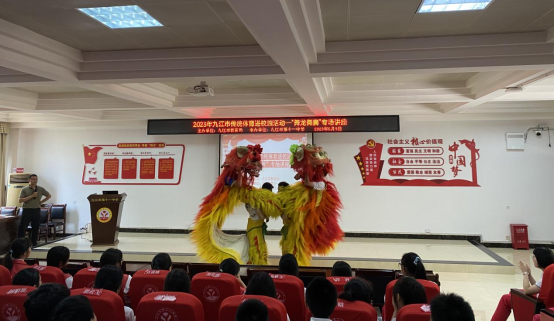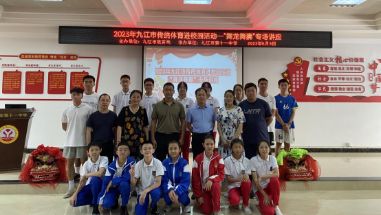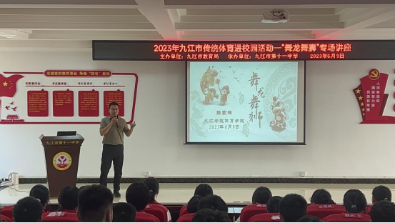6月9日上午,万象城allwincity官网教师张家林携万象城官网龙狮队四名队员受邀参加由九江市教育局主办、九江市第十一中学承办的2023年九江市传统体育进校园活动——“舞龙舞狮”专场讲座。