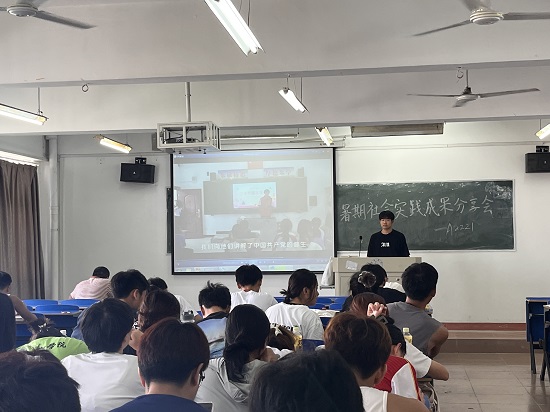 在活动中,各团支部组织暑期“三下乡”、个人返家乡等社会实践活动成员深入各班,通过PPT展示、观看社会实践过程中的记录视频、心得分享、成果展示及互动讨论等形式,分享了实践中的所见、所得与所想,使广大青年大学生对社会实践活动有了更深刻的认识,切实引领同学们在社会实践中学党史、强信念、跟党走,充分激发新时代青年小我融入大我,青春献给祖国的奋斗热情。