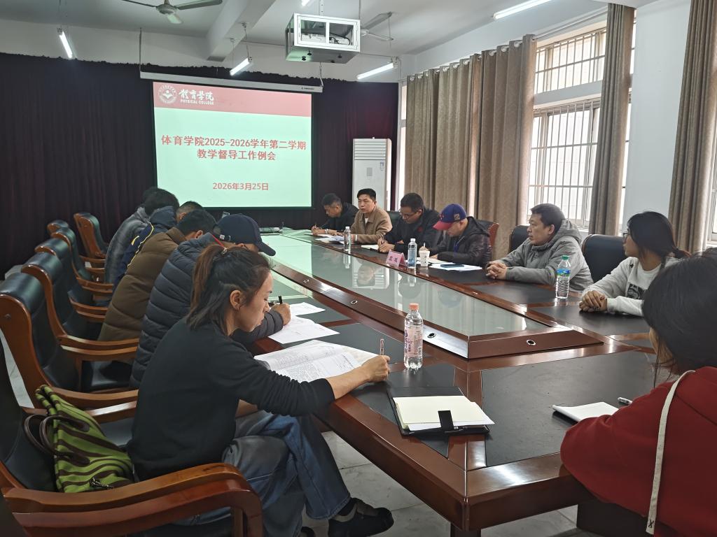 会议首先由学院督导组组长王东升副院长介绍此次会议精神以及会议基本要求,并热烈欢迎校级督导虞斌教授的到来。随后由学院督导组副组长毛敏副院长通报本月教学督导整体情况。本月,督导组累计开展推门听课30余人次,覆盖体育教育、社会体育指导与管理等专业的技能课、理论课、公体课,重点核查了课堂纪律、教学效果、教案、教学大纲、作业批改等教学材料。整体来看,学院课堂教学秩序规范,青年教师教学能力稳步提升,部分技能课课堂互动性、实践性表现突出,但仍存在部分理论课内容更新滞后、抬头率与前排就座率较低,公体课到课率不均衡等问题。
