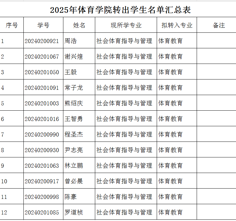根据《九江学院学生转专业管理办法(试行)》九院字【2024】111号文件的规定,经过学生本人申请,且申请转出人数符合学校的规定,批准2024级社会体育指导与管理专业的12名学生拟转出申请,公示名单如下: