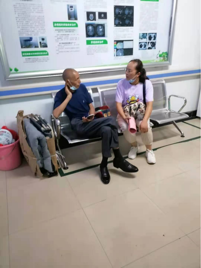 7月7日,陈世云和李月娟两位老师坐了7个小时的火车来到赣州,准备去B1911班一同学家家访,该同学家在赣州市崇义县上堡乡竹溪村。因为她爸爸刚好7月8日早上要去赣州市第一人民医院进行住院化疗,所以家访地点就改在赣州市第一人民医院。该学生因为在南昌打工请不到假,我们就直接与学生爸爸约好在医院休息区见面。