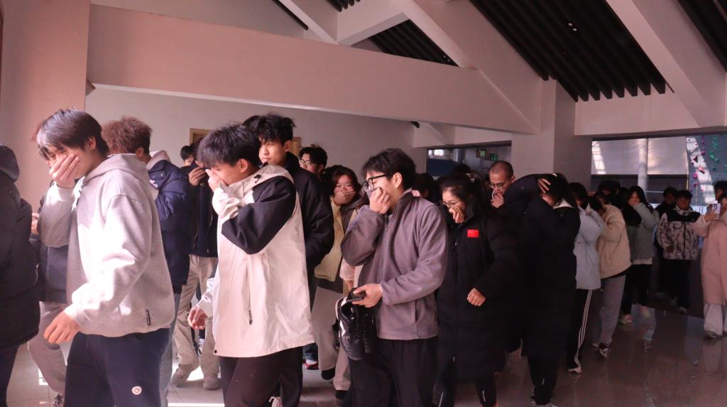 随后,演练进入实战环节。随着模拟烟雾在教学楼内迅速扩散,同学们反应迅速,严格按照预定的逃生路线,有序地撤离教学楼。在整个疏散过程中,付超警官全程指挥协调,确保了演练的安全与高效。最终,全体人员安全完成疏散,并在指定集合点集合。