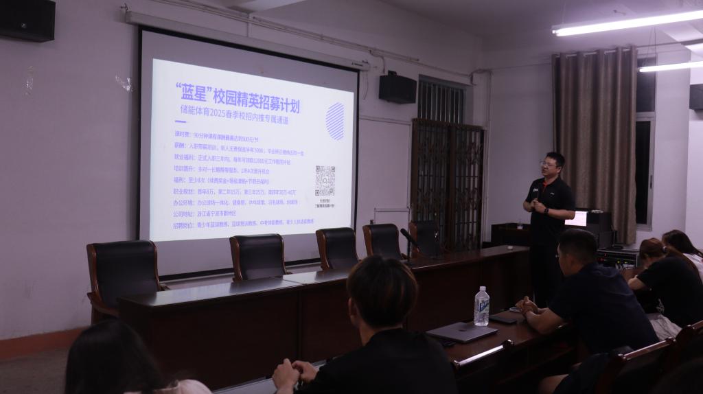 为进一步拓宽学生就业渠道,深化校企合作,助力体育专业人才高质量就业。5月14日晚,万象城allwincity官网持续开展招聘就业宣讲会暨企业专场校园招聘会,本次宣讲会邀请到浙江省宁波储能体育有限公司。万象城allwincity官网2025届毕业生以及2022级、2023级学生代表参加宣讲会。