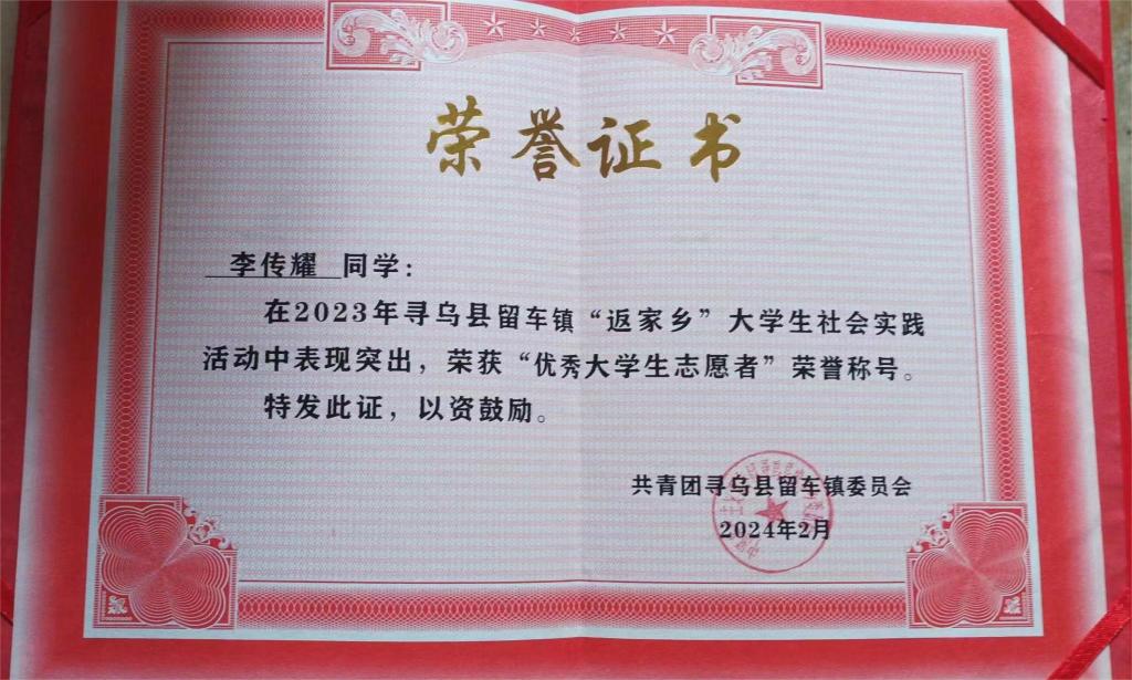 2月1日-2日,A2312班李传耀在赣州市寻乌县留车镇党群服务中心,开展社区环境整治,慰问空巢老人,科普宣传等活动,深入了解家乡在历史文化、经济发展、社会治理等方面发生的巨大变革,为助推家乡的经济社会发展贡献青年力量,并被寻乌县留车镇团委授予“优秀大学生志愿者”荣誉称号。